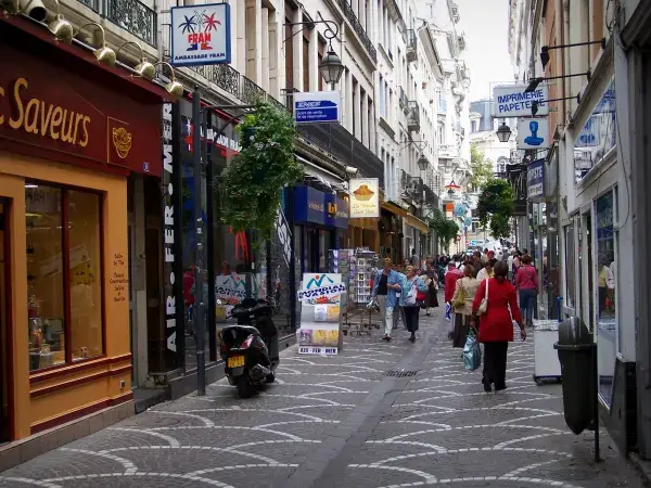 Des personnes marchent dans une rue animée d'une ville, entourées de bâtiments et de commerces.